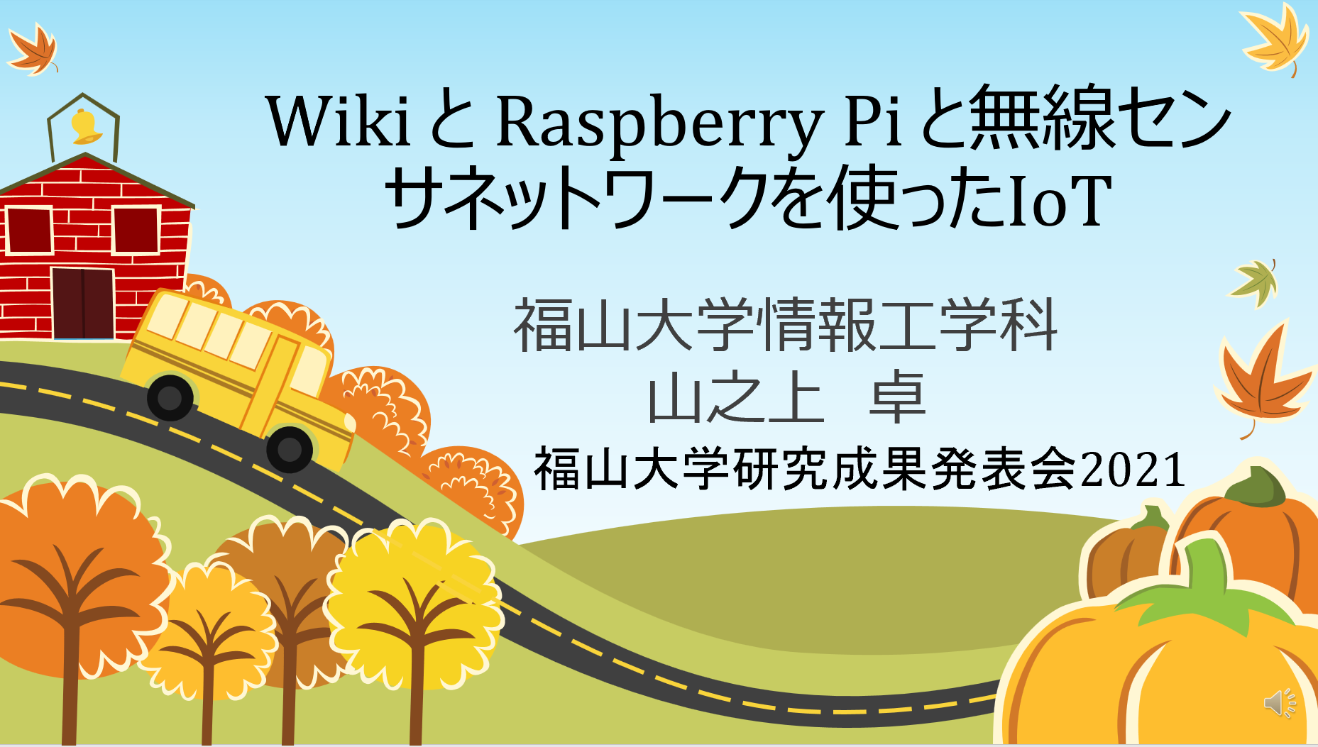- 高橋, 林, 香川, 森田, 山之上, 金子,"音響センサネットワークを用いた降雨量推定に向けた雨音の分析," 第29回計測自動制御学会中国支部学術講演会講演論文集,pp. 59-60,Nov.2020.