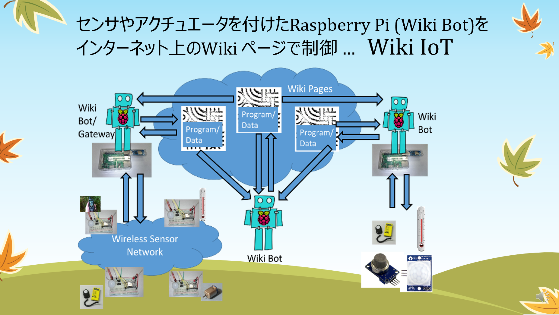 里山における災害の予兆検知を行うことを目標に、WikiとRaspberry Piと無線センサネットワークを使ったIoTシステムの研究を行っています。里山のあちこちで、その場所の照度・温度・湿度・気圧・地磁気・加速度・音・近くの動物の動き・位置・時間等を入手し、Wiki(ブラウザで簡単に編集することができるWebページ)のページに、それらのデータを書き込みます。このデータを蓄積し、人工知能を使って、過去に発生した災害と照らし合わせることにより、災害の予兆を検知しようとしています。また、無線センサネットワーク端末にデータ転送機能を付けることにより、電波が直接届かない場所でも、データの収集を可能にします。