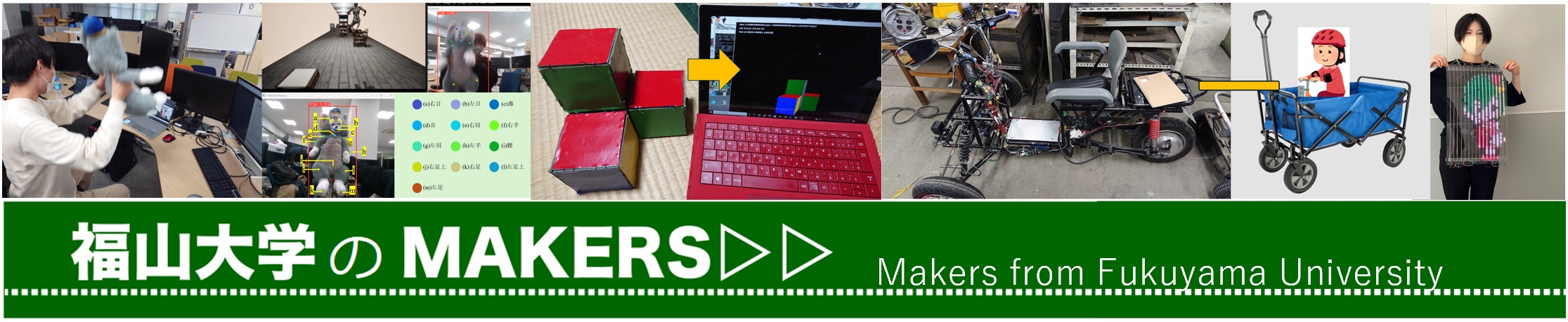 - MFT2018... 着る電光掲示板, 声の指示で動くフォークリフト、声の指示で動く発光ダイオードテープ、クソゲー、IoTゲーム、うちわでファイト、....