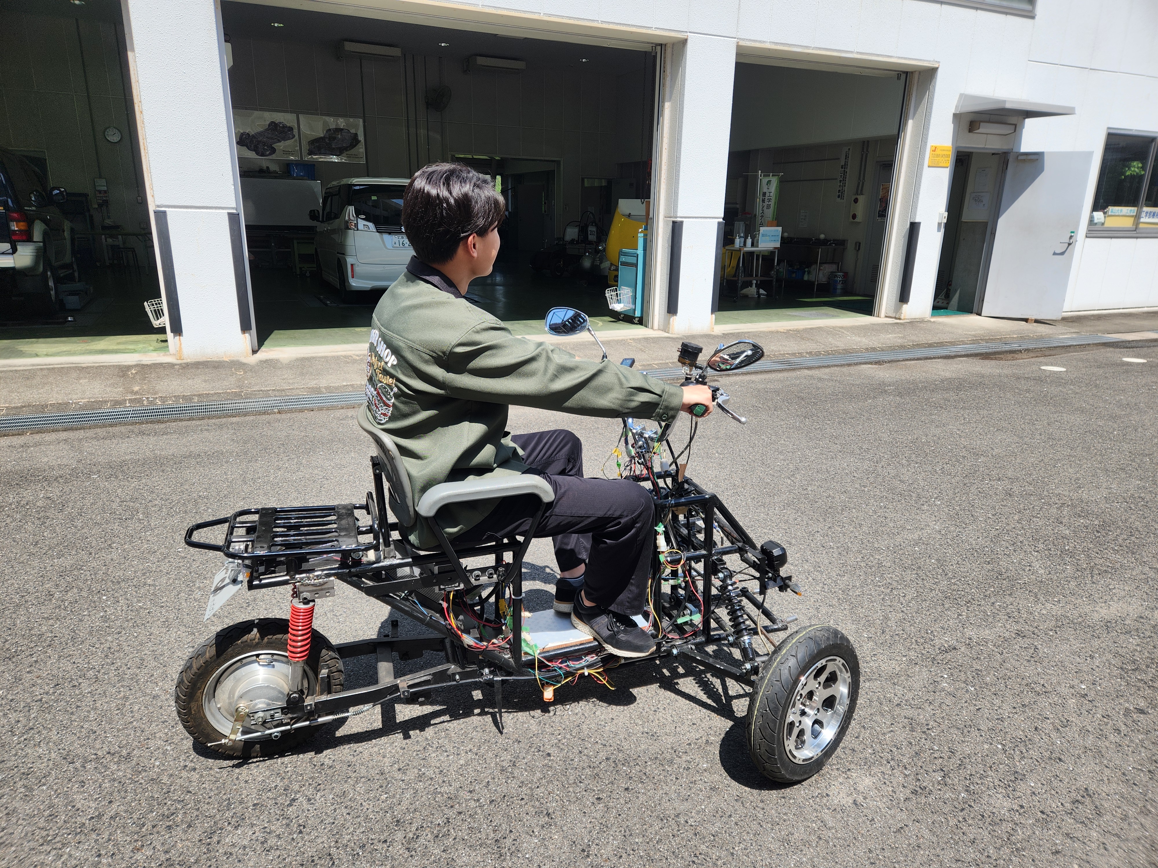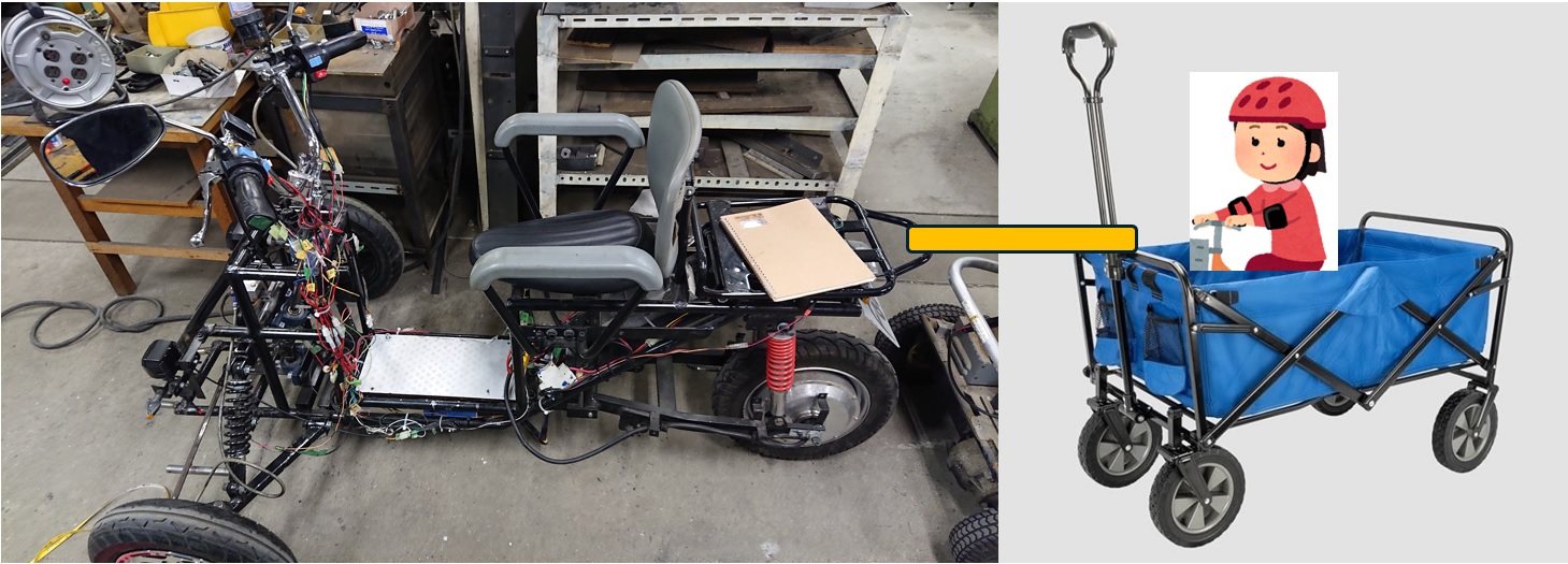 - 機械システム工学科の研究室で、子育てママに安心安全な三輪車(逆トライク)「ママモビ」の研究開発を行っています。ママモビに子供が乗ることができるキャンプ用キャリーワゴンをけん引させて、子供さんも楽しむことができる展示を行う予定です。