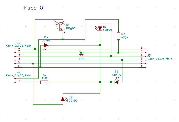 サイコロの1つの面の(赤外線)発光ダイオードとフォトトランジスタは次のような回路を構成しています。