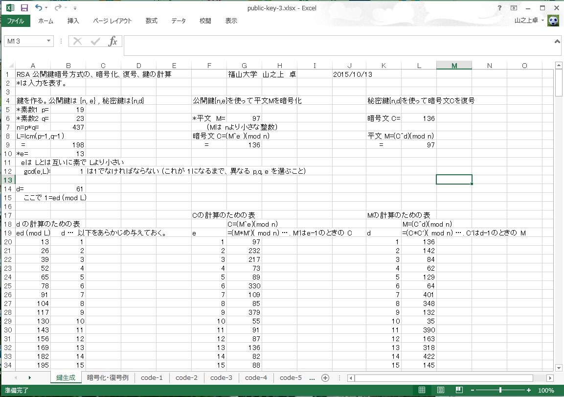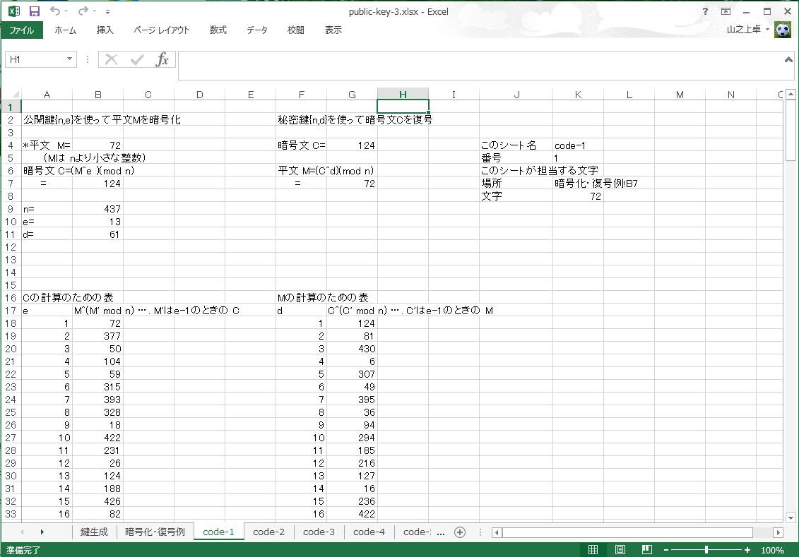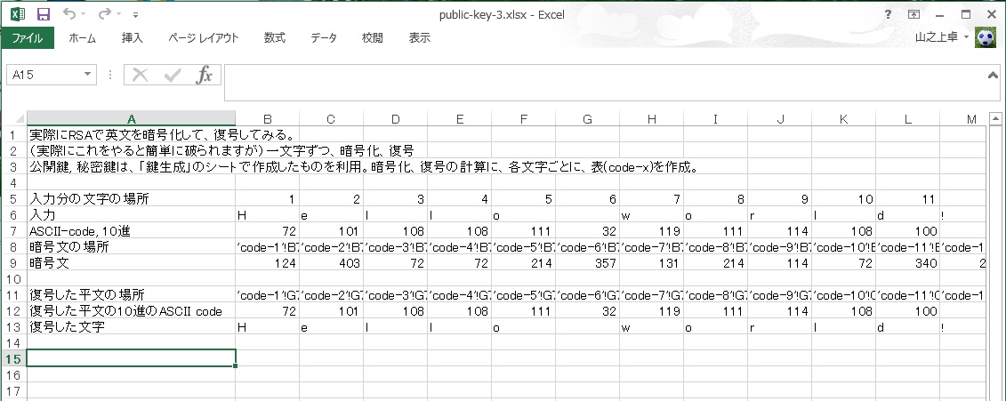 上の鍵ペアを使った、短い文の暗号化と復号の例(シート「暗号化・復号例」)
