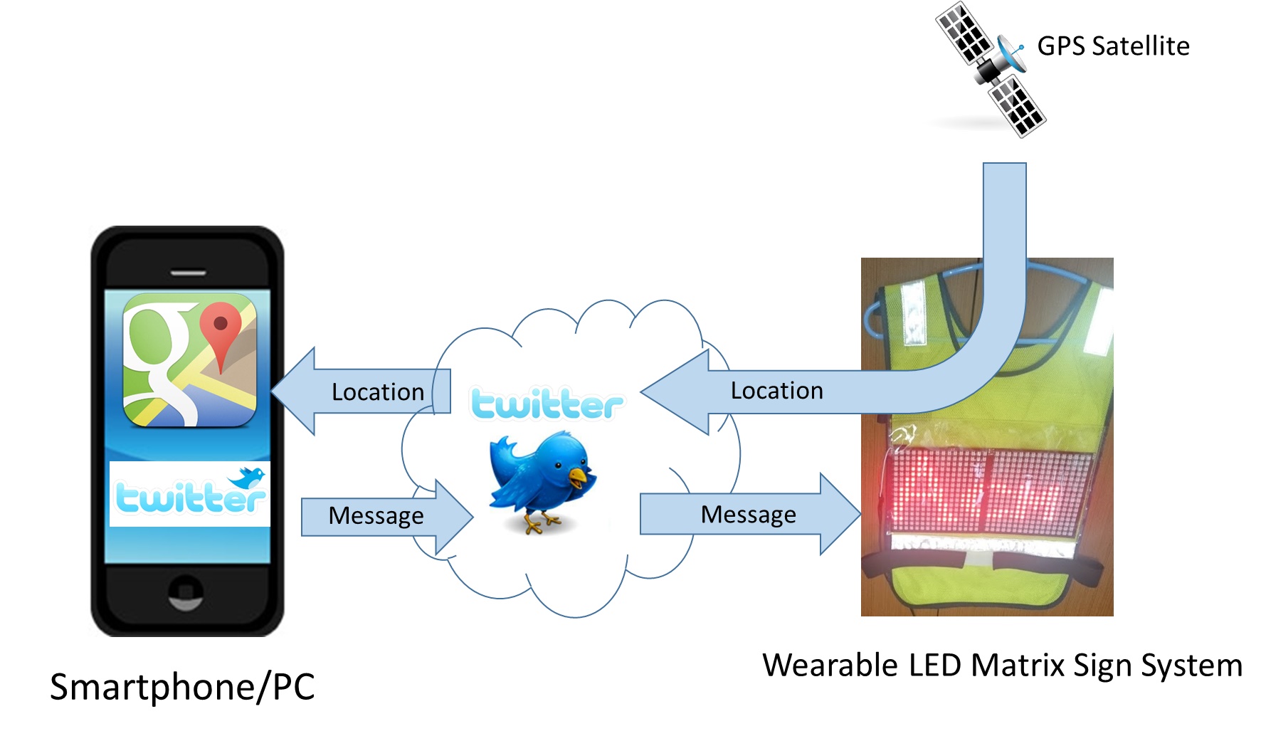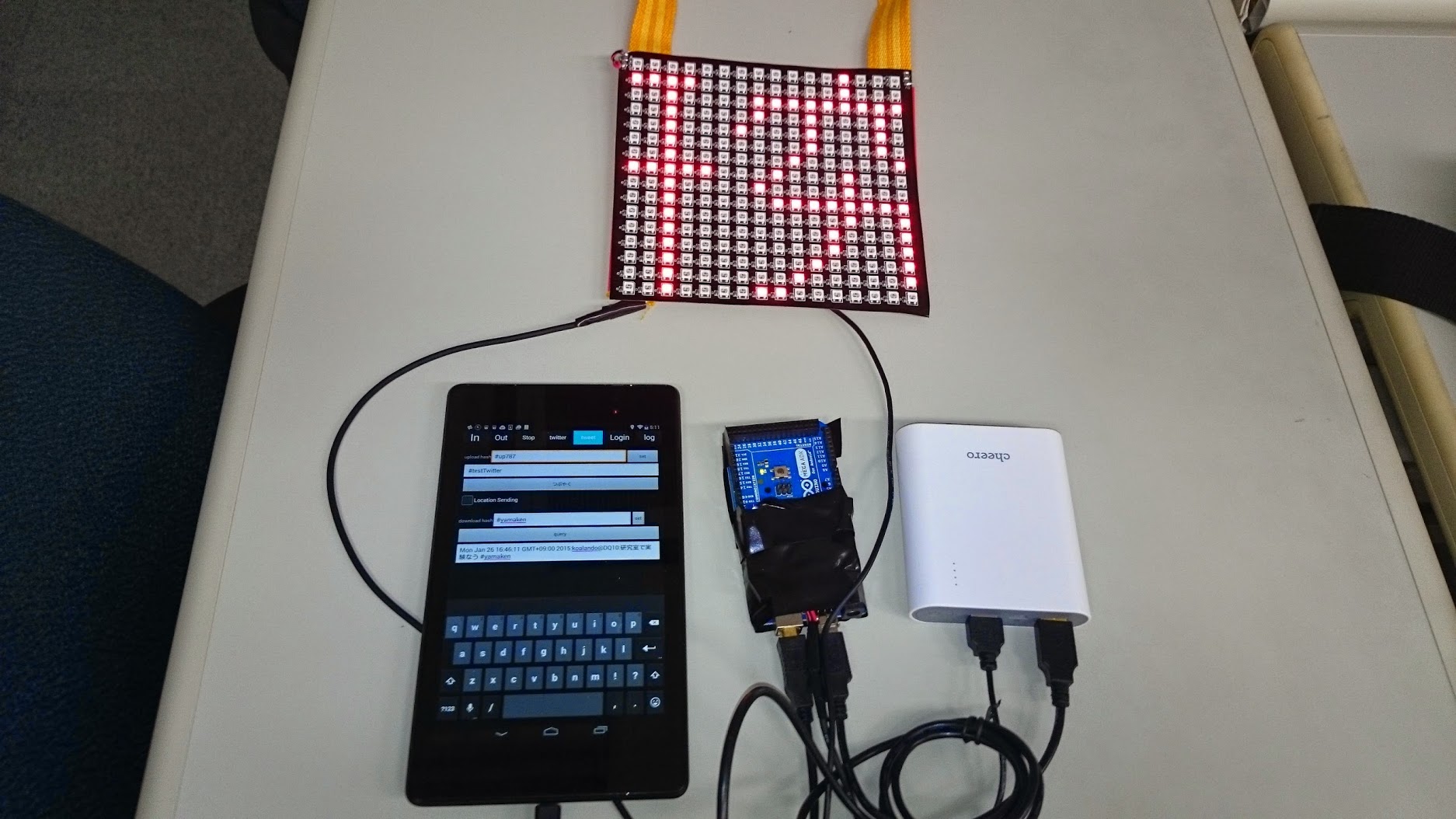 - 着るLED Matrix 電光掲示板は、特定のハッシュタグが付いた twitter のつぶやきを Android 端末が twitter から抽出し、そのつぶやきを文字フォントの bitmap に変換して Arduino Mega ADK に送り、Arduino Mega ADK (Arduino)がその信号を NeoPixel? LED Matrix 表示用に変換して シリアル信号として NeoPixel? LED Matrix に送っています。