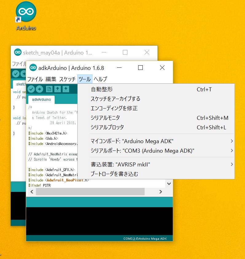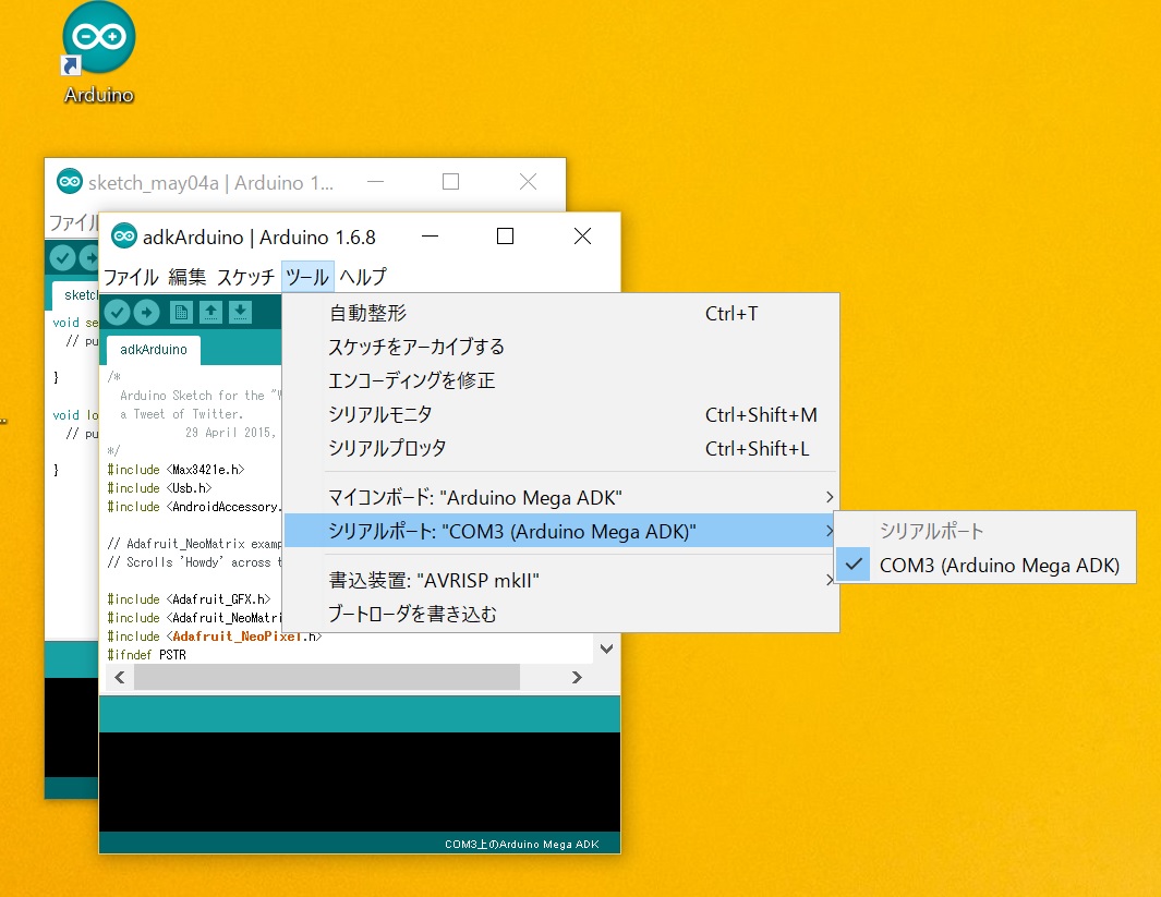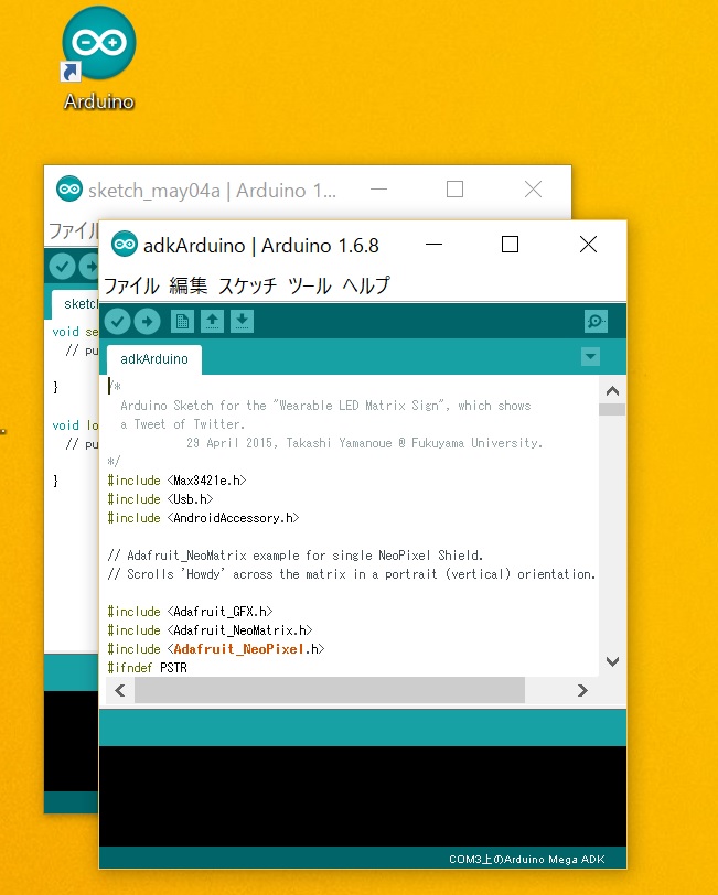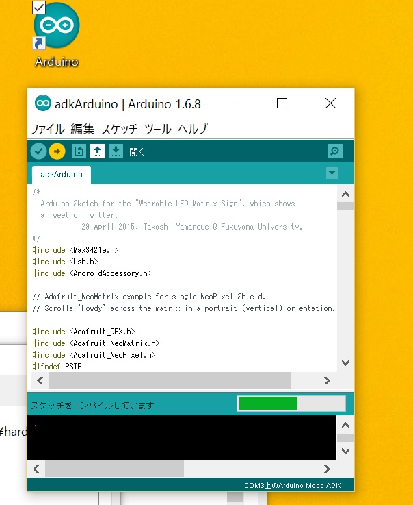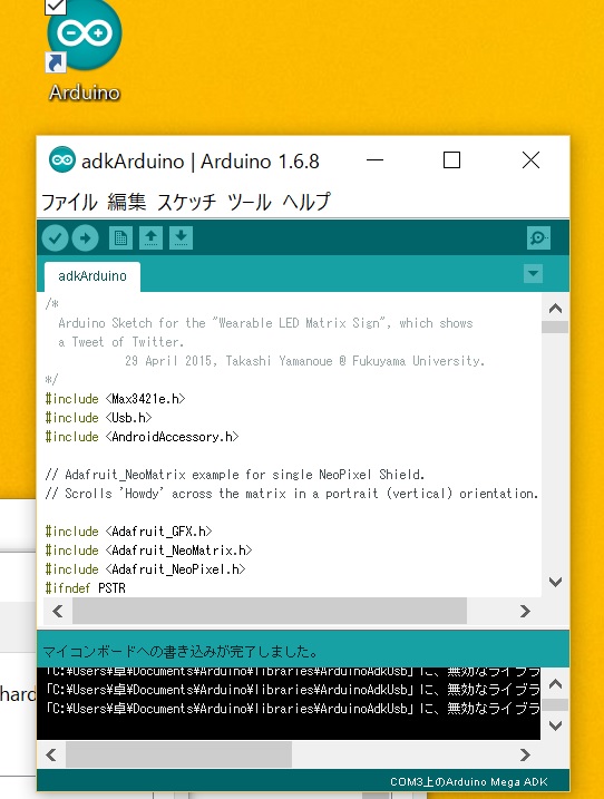 - Arduino の firmware とは、Arduino で動かすプログラム(スケッチ)です。このプログラムは Android 端末から ADKを通じて送られてきた文字フォントの bitmap を、NeoPixel LED Matrix 表示用に変換して、NeoPixel LED Matrix にシリアル信号として送ります。