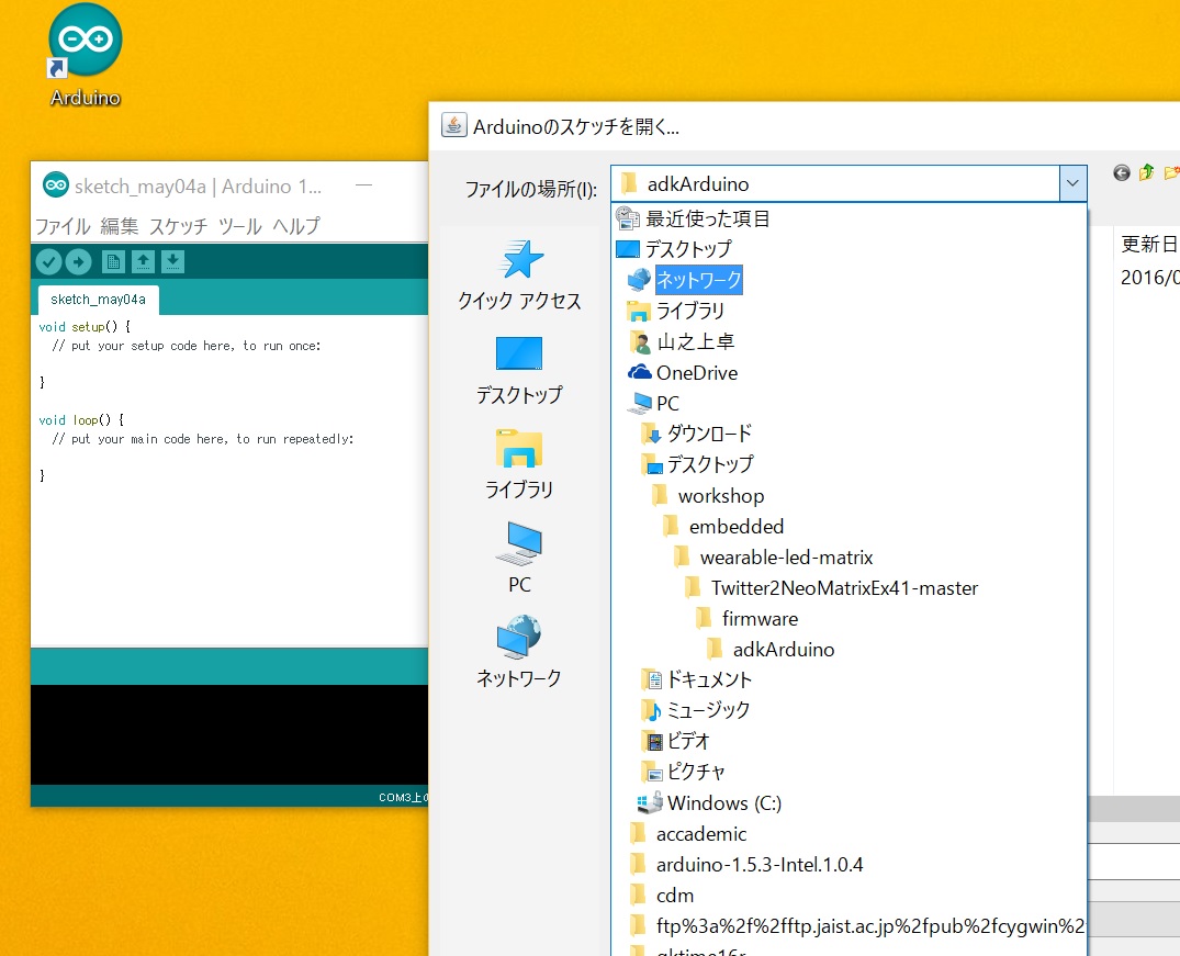 - Twitter2NeoMatrixEx4をダウンロードしたパソコンで、Arudino IDE のインストールがまだである場合は、そのパソコンに Arduino IDEをインストールします。方法は以下などを参照してください。