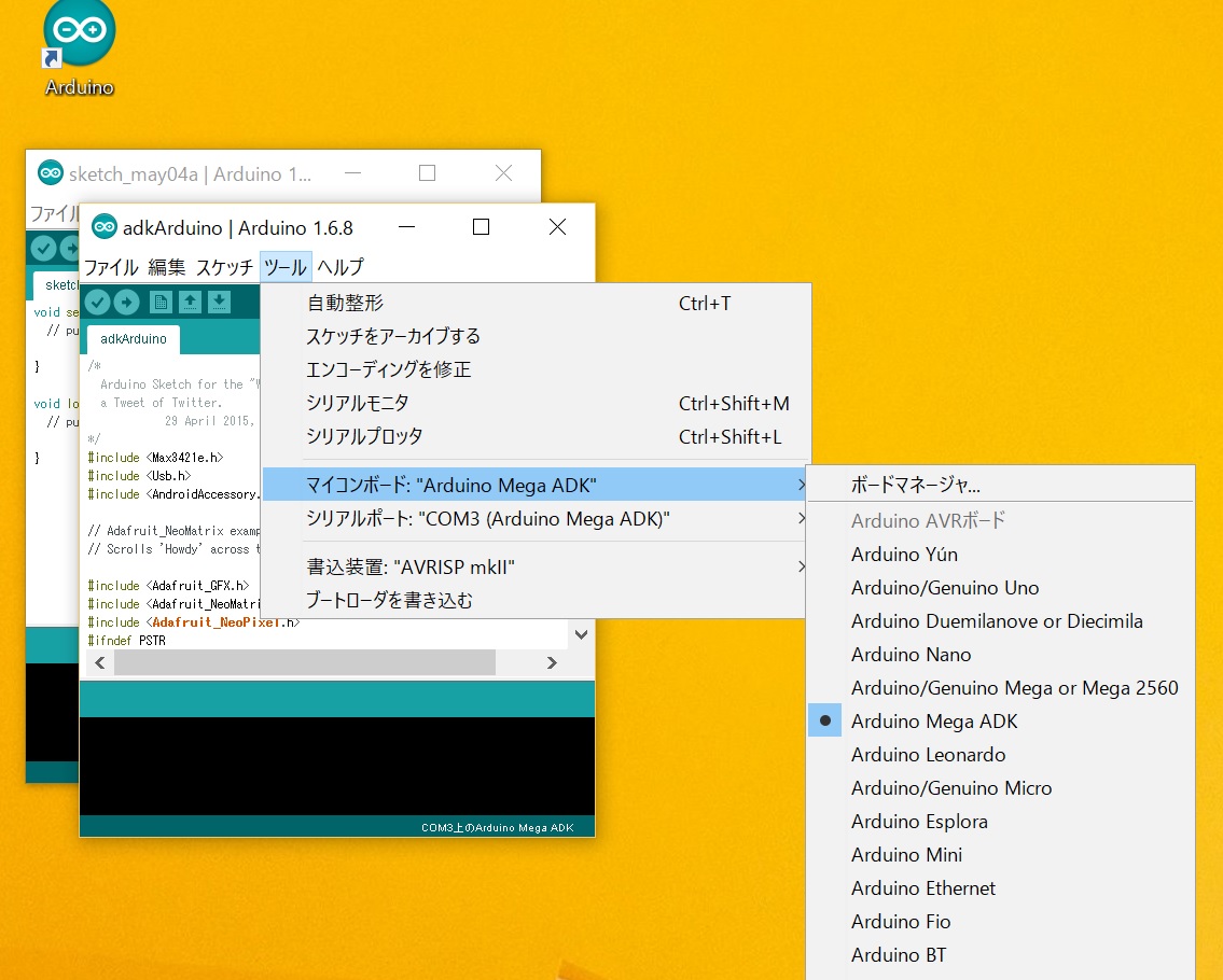 Arduino IDEでのボードの選択と通信ポートの選択。†