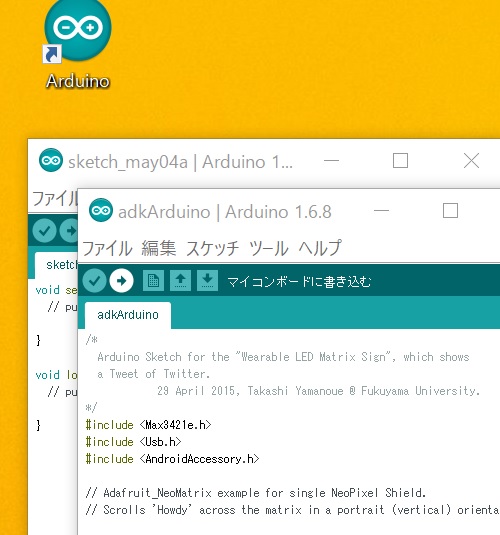 - 着るLED Matrix 電光掲示板は、特定のハッシュタグが付いた twitter のつぶやきを Android 端末が twitter から抽出し、そのつぶやきを文字フォントの bitmap に変換して Arduino Mega ADK に送り、Arduino Mega ADK (Arduino)がその信号を NeoPixel LED Matrix 表示用に変換して シリアル信号として NeoPixel LED Matrix に送っています。