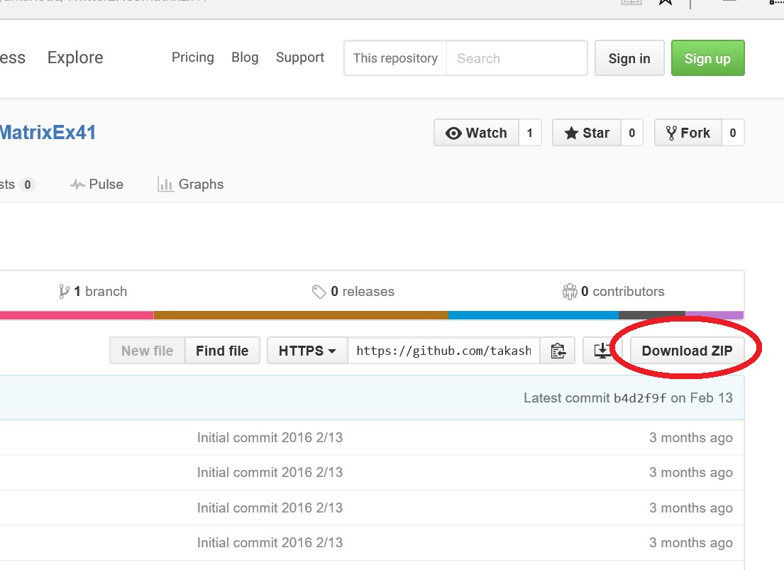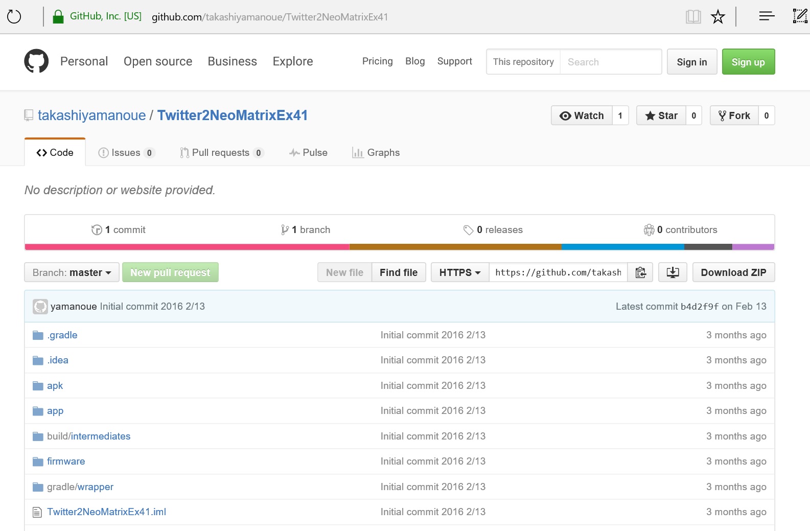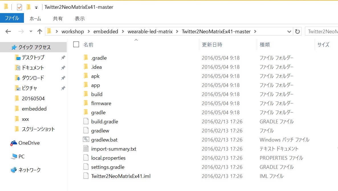 - これ(twitter2NeoMatrixEx41)を開いて、Zip ファイルをパソコンにダウンロードして、適当なディレクトリで展開します。このパソコンから、Arduino に firmware を書き込んだり、Android にアプリをuploadしたりします。このディレクトリ名を Twitter2NeoMatrixEx41-master とします。