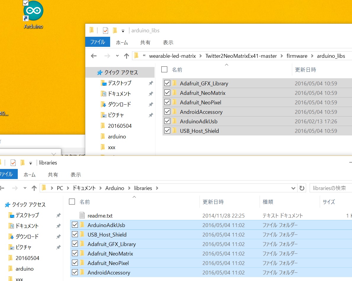 - Twitter2NeoMatrixEx41-master の下の firmware の下の arduino_libs の下のすべてのディレクトリを, ユーザの Arduino IDEの libraries ディレクトリの下にコピーします。