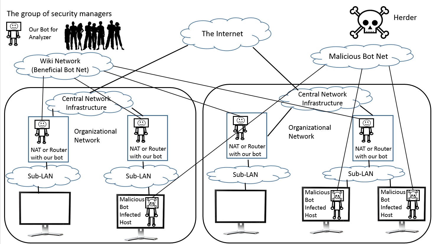 我々は, Wiki を使って, NAT等で保護されたLAN内通信をLANの外から監視し, 緊急時には, 基幹ネットワークの設定変更等を行うことなく, 疑わしい通信を遮断したり, 制御したりすることを可能にするシステム(良性ボット)や, Wiki に書かれたプログラムによって, 複数のWebページのデータを集計するシステムの研究と開発を行っている。これらのシステムを改良・拡張して組み合わせることにより, 上で述べたようなボットの監視の仕組みで使う機器を容易に開発可能である。